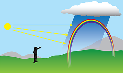 A rainbow is formed by sunlight and atmospheric conditions. Light enters a water droplet, slowing down and bending as it goes from air to denser water. The light reflects off the inside of the droplet, separating into its component wavelengths, or colours. When light exits the droplet, it makes a rainbow.