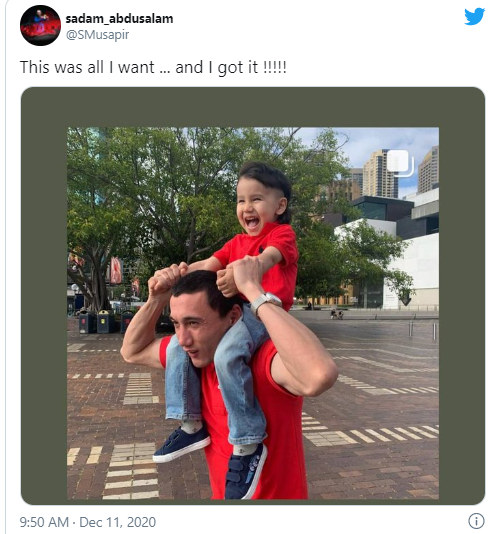 Keluarga itu berkongsi gambar pertemuan emosi mereka di Lapangan Terbang Sydney pada hari Jumaat. Abdusalam tidak pernah bertemu dengan anaknya sebelum ini, yang lahir pada tahun 2017. “Terima kasih Australia. Terima kasih semua,” Encik Abdusalam membuat kicauan di Twitter.